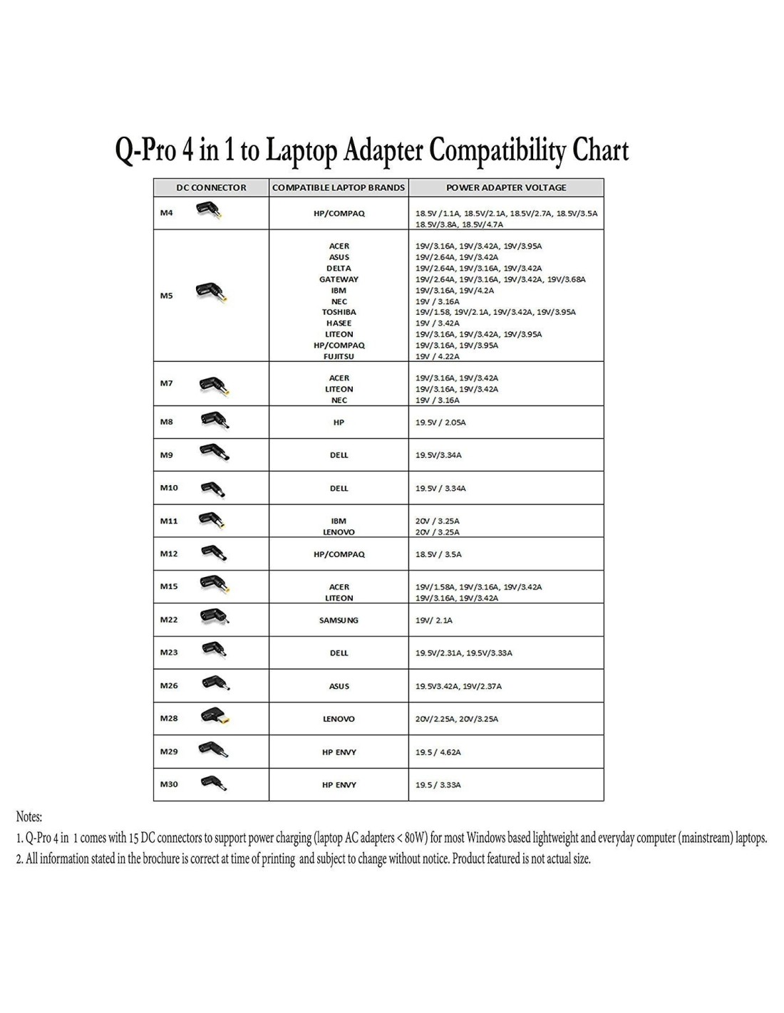 El Q-Pro 4 en 1 viene con 9 puntas de conector de CC que admiten la carga de energía para la mayoría de las computadoras portátiles (convencionales) livianas y de uso diario basadas en Windows. Consulte la tabla de compatibilidad de adaptadores de CA Q-Pro 4 en 1 a notebook.